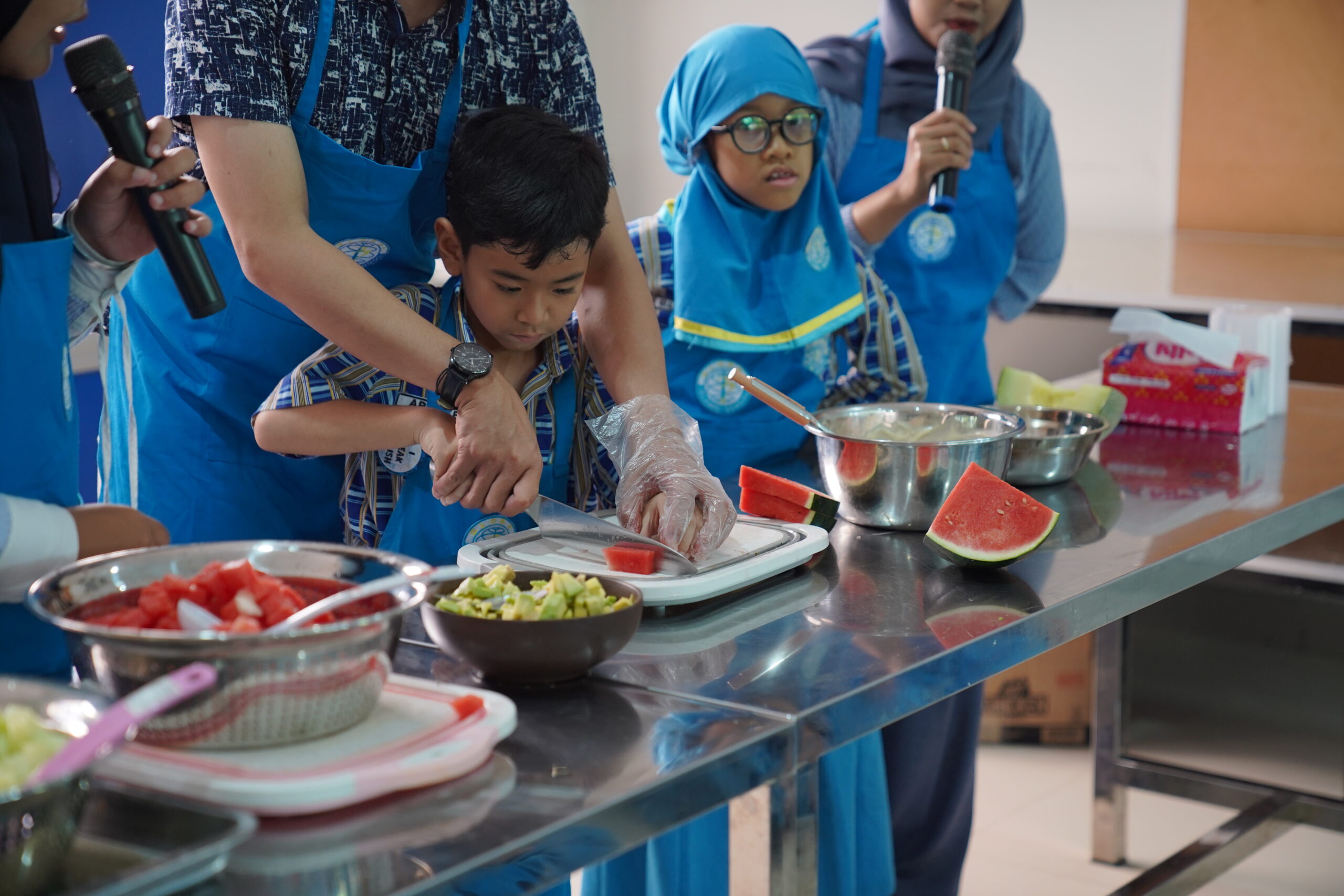 Sebelum diberi kesempatan untuk membuat sendiri saladnya, beberapa siswa terlebih dulu praktik mengiris buah-buahan. Tentu dengan bimbingan guru maupun pendamping agar pisau yang digunakan tidak melukai siswa. Aktivitas ini melatih siswa untuk selalu berhati-hati dan teliti ketika melakukan sesuatu.