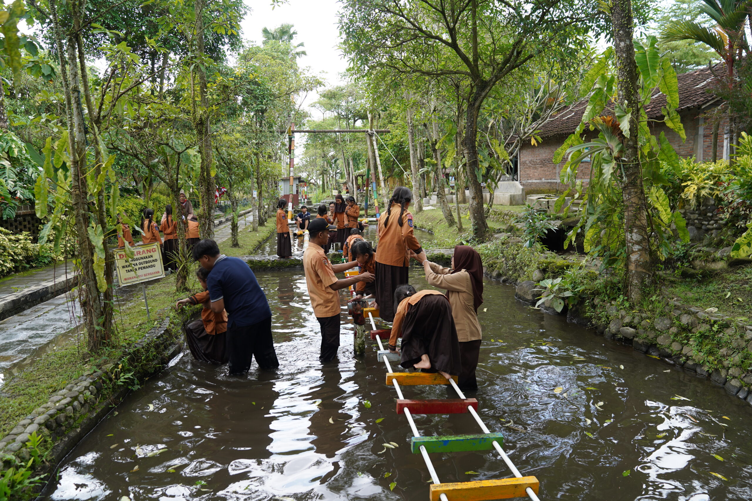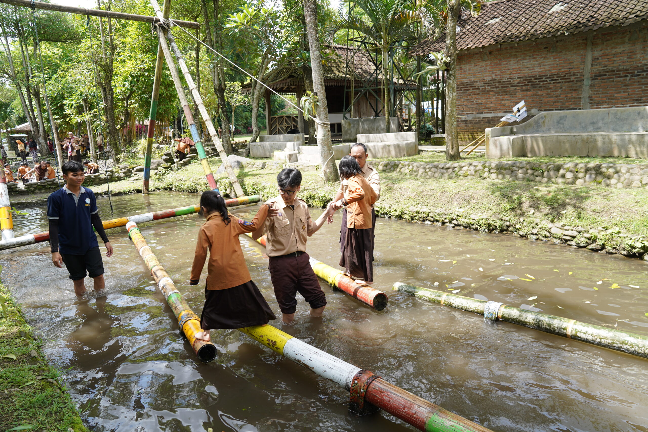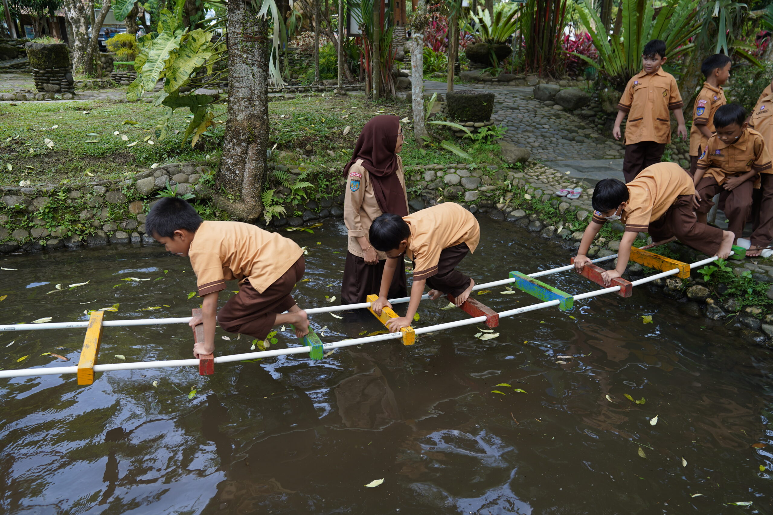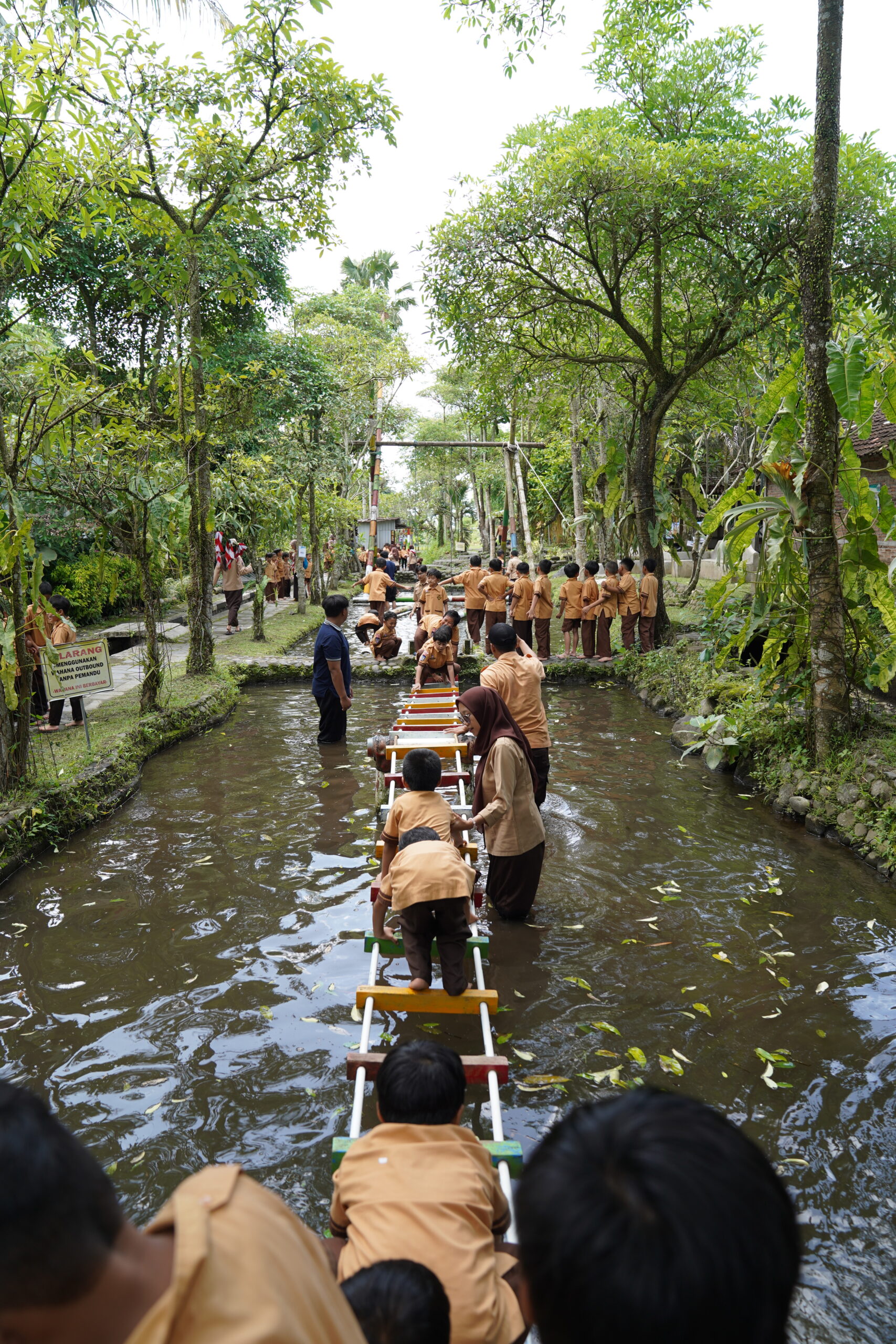 Selesai dengan wahana darat yang banyak menguji ketangkasan, kekompakan, dan koordinasi antarsiswa, mereka diajak memainkan permainan-permainan di air. Keceriaan semakin terasa. Bersentuhan dengan air membuat siswa kian antusias.