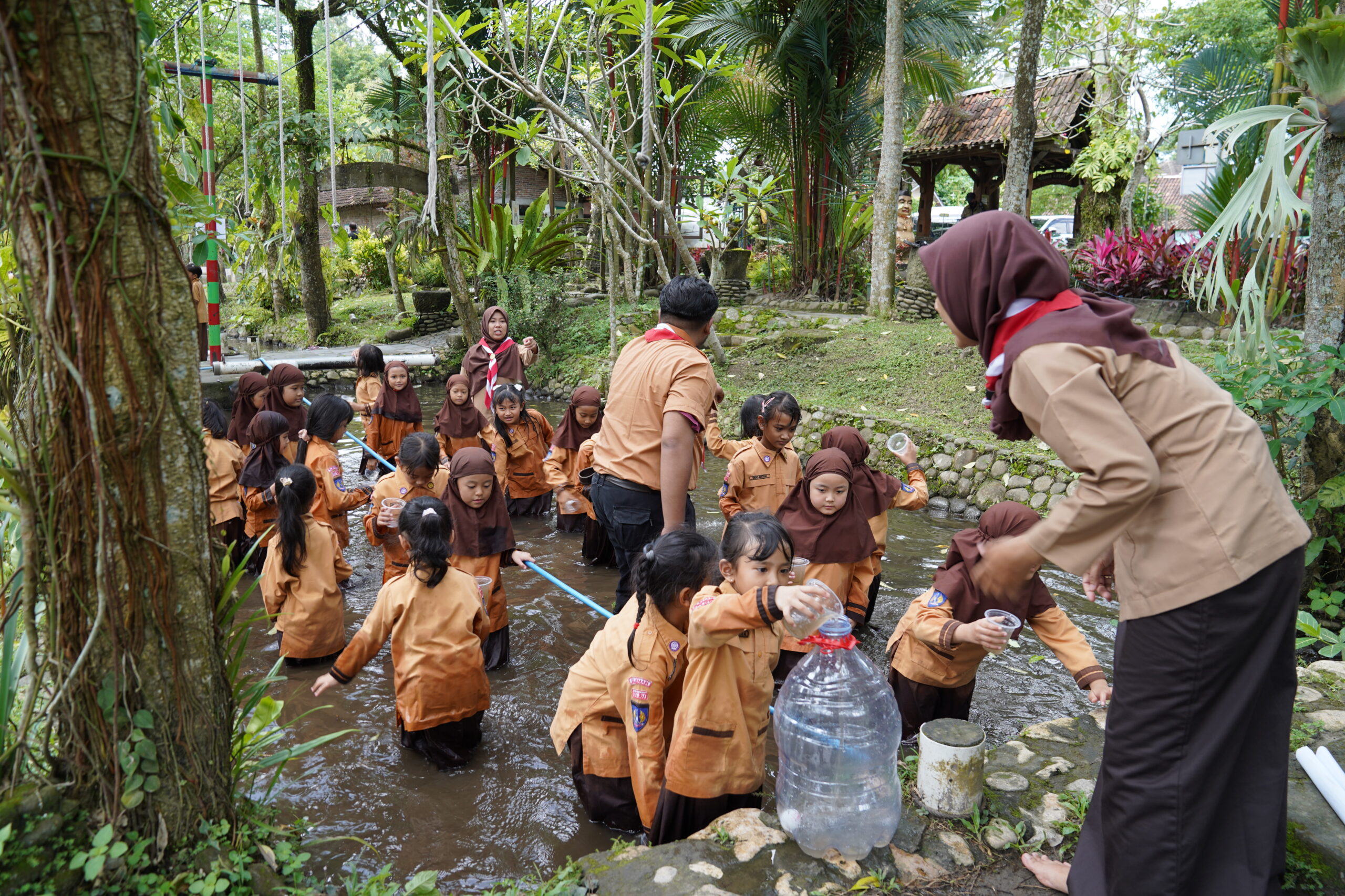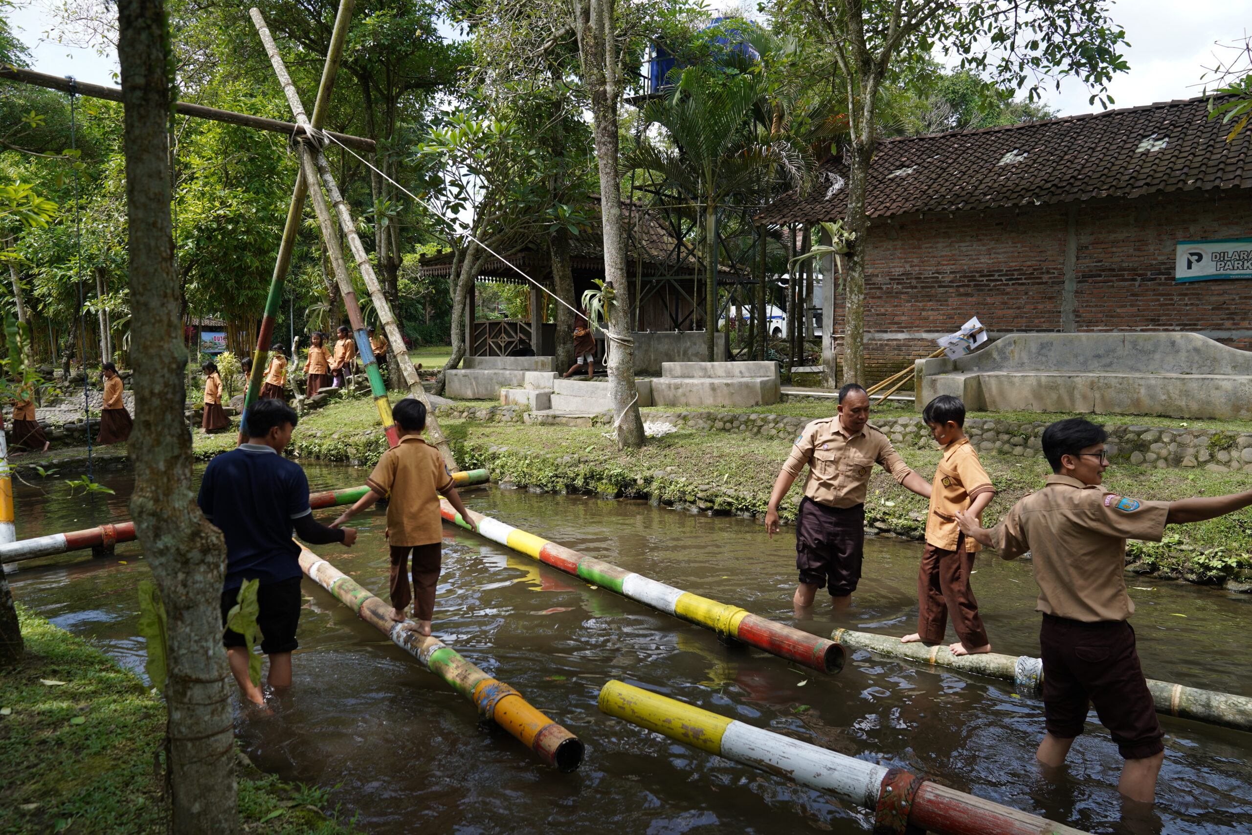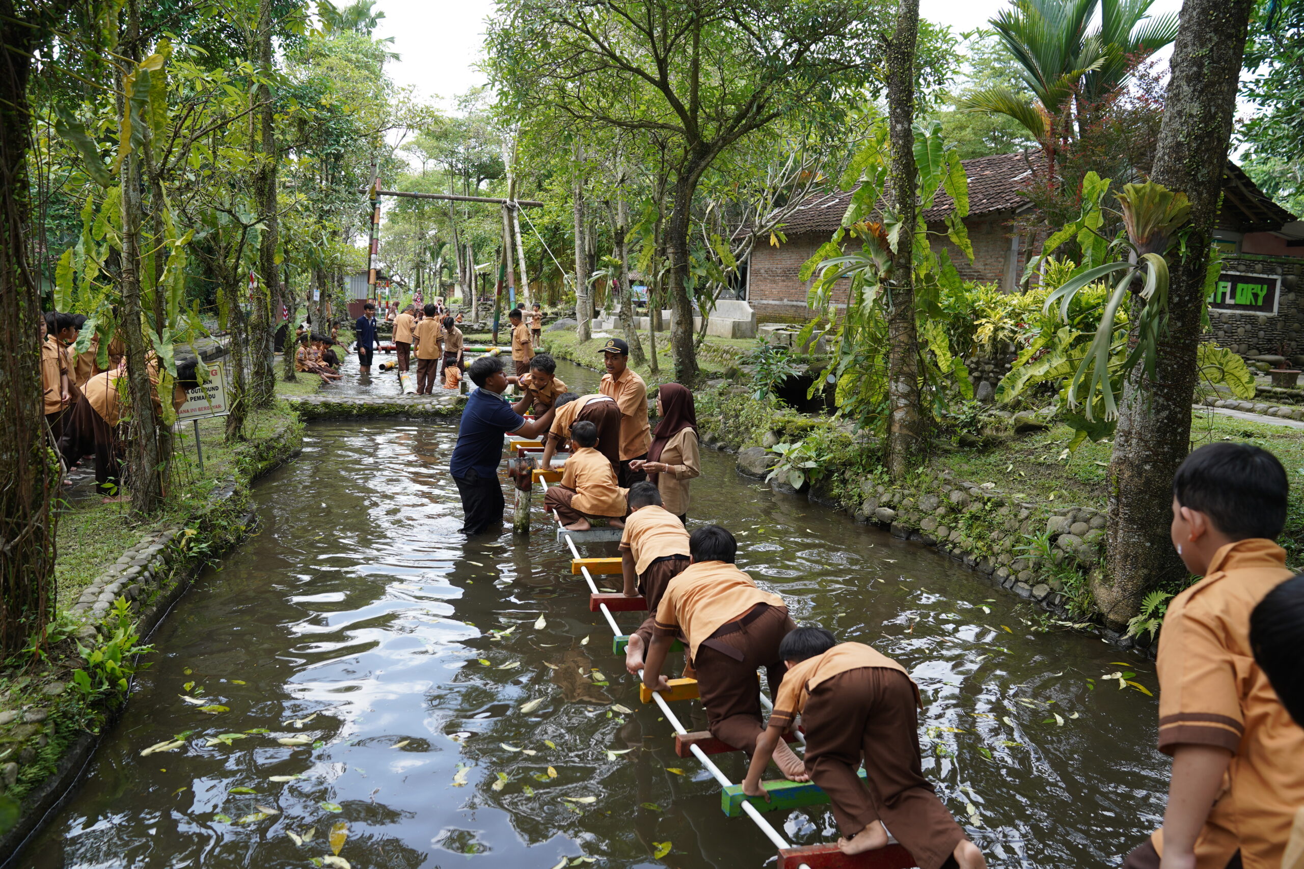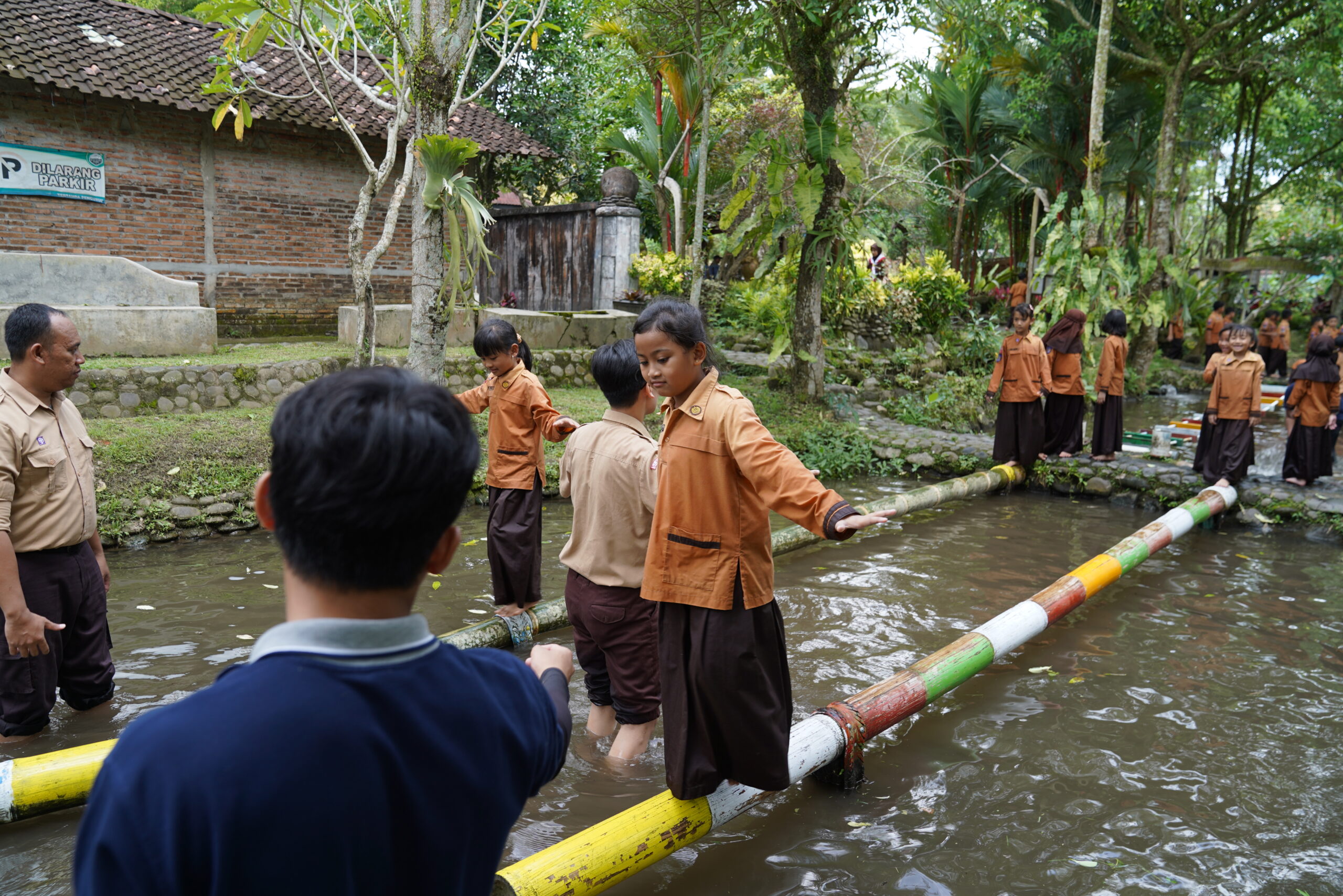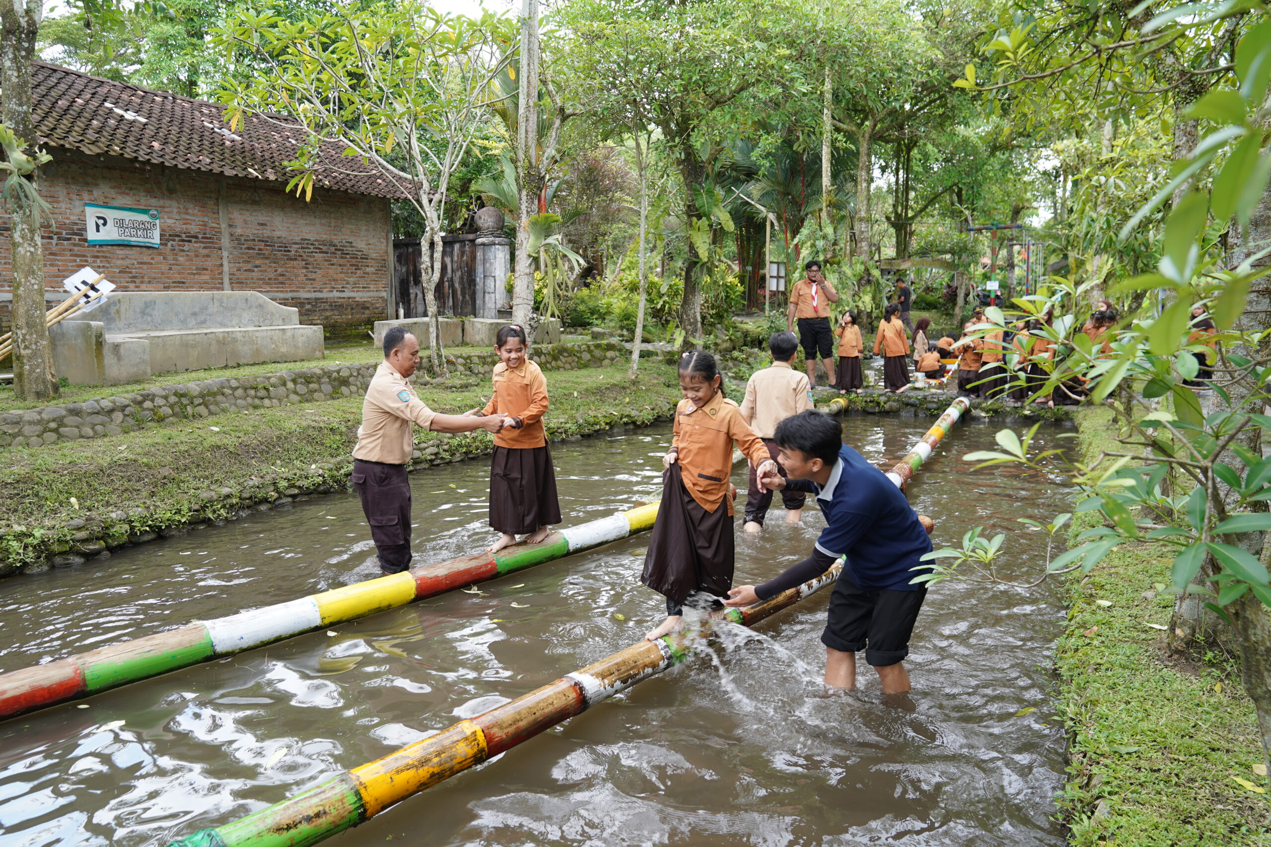 Selesai dengan wahana darat yang banyak menguji ketangkasan, kekompakan, dan koordinasi antarsiswa, mereka diajak memainkan permainan-permainan di air. Keceriaan semakin terasa. Bersentuhan dengan air membuat siswa kian antusias.