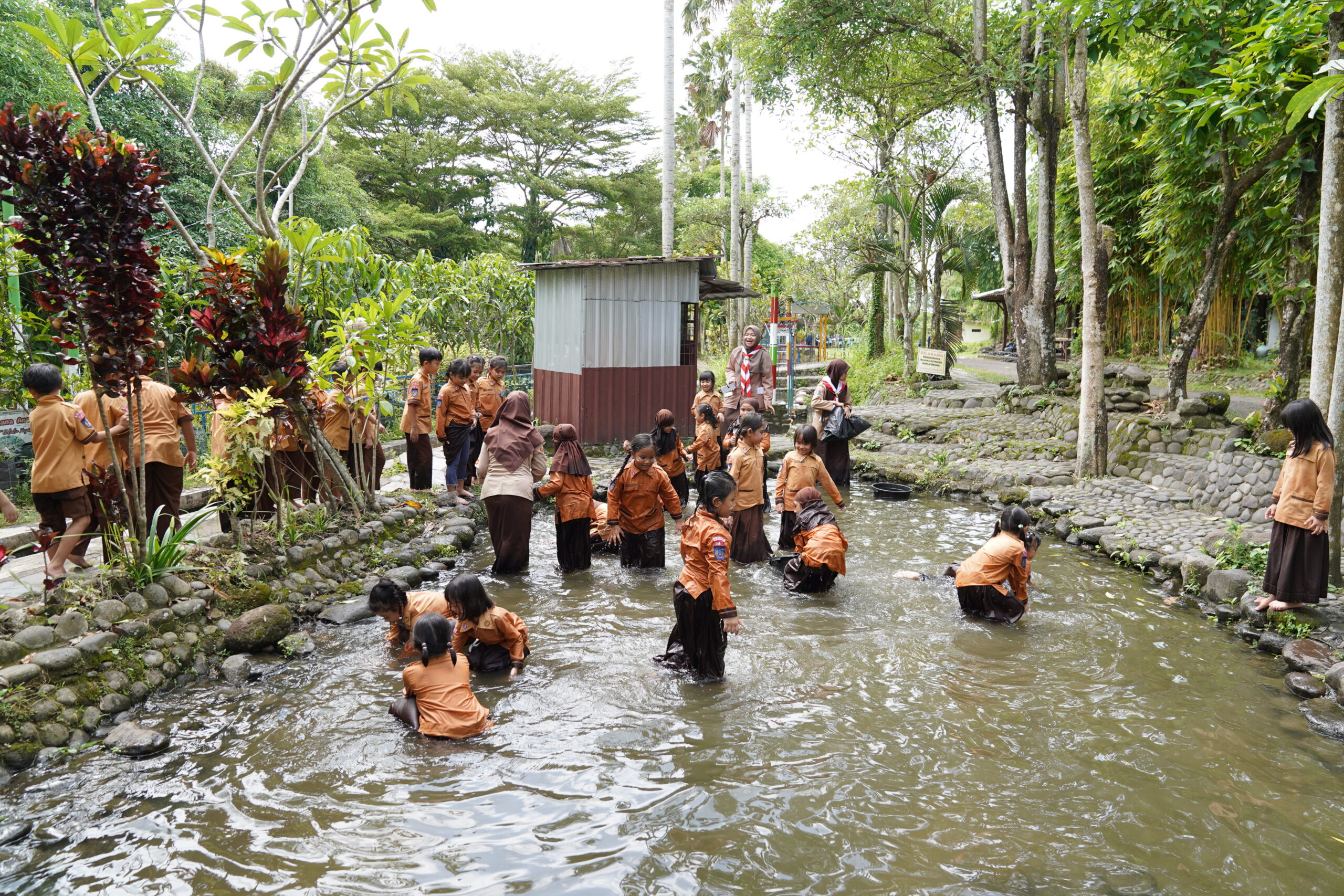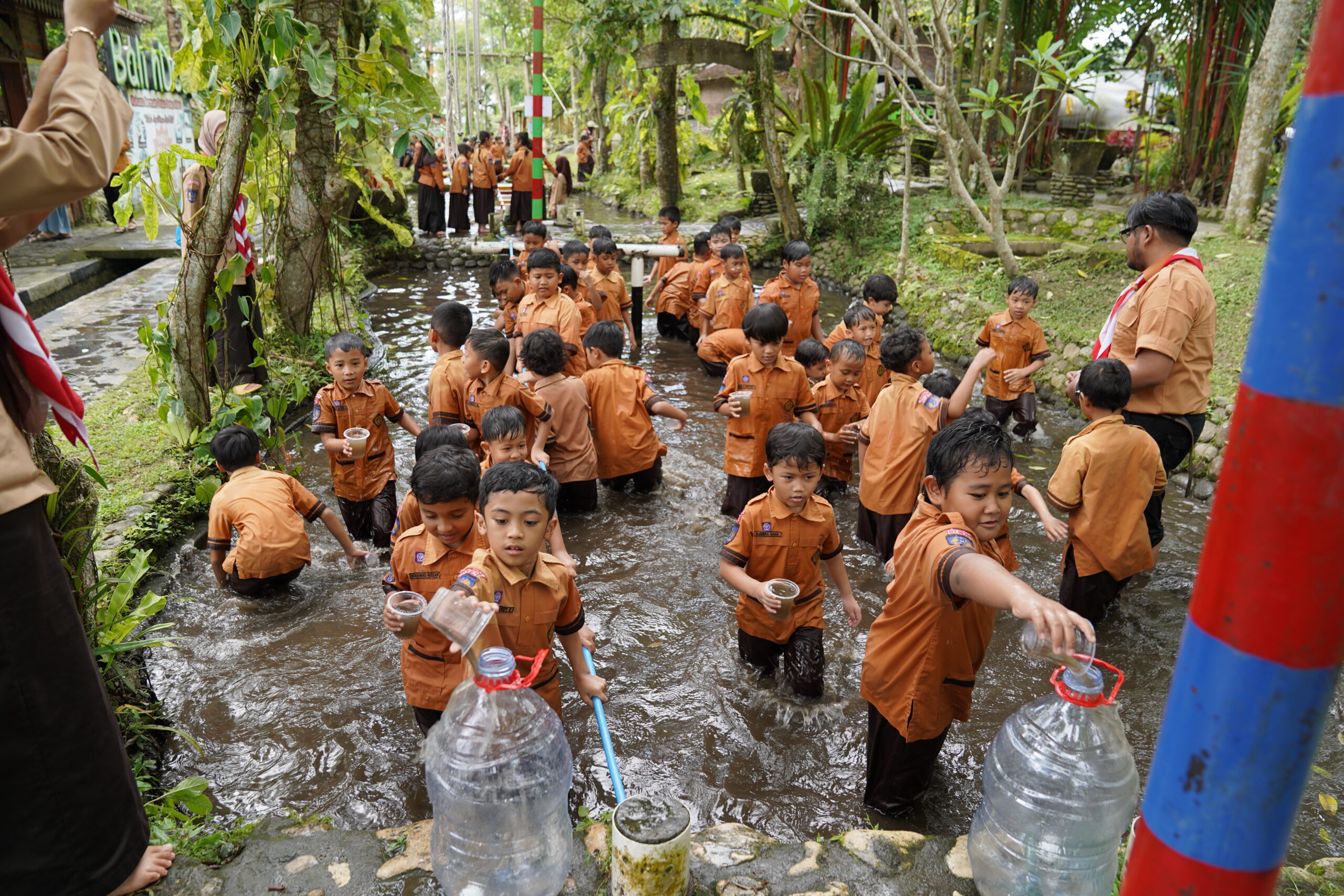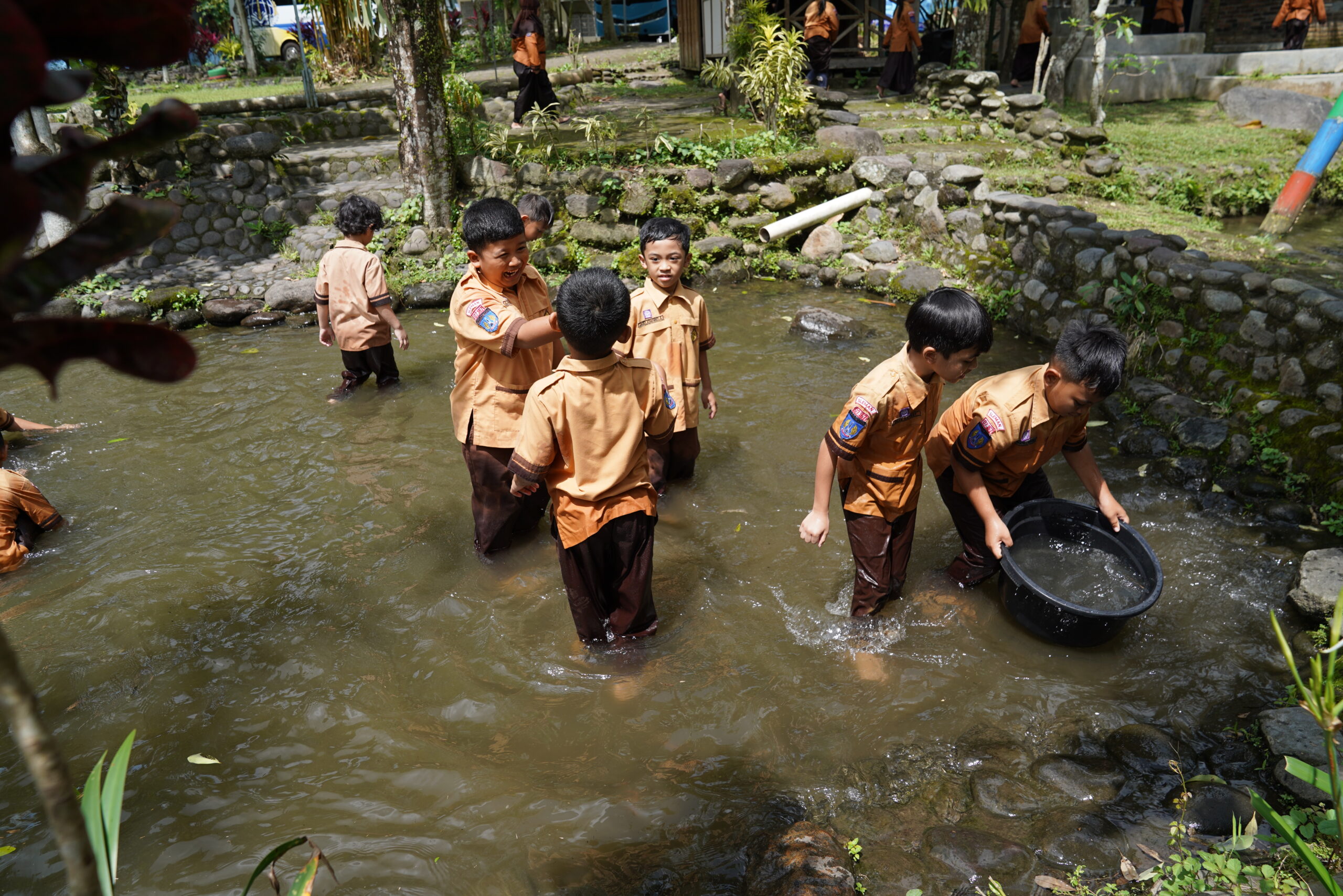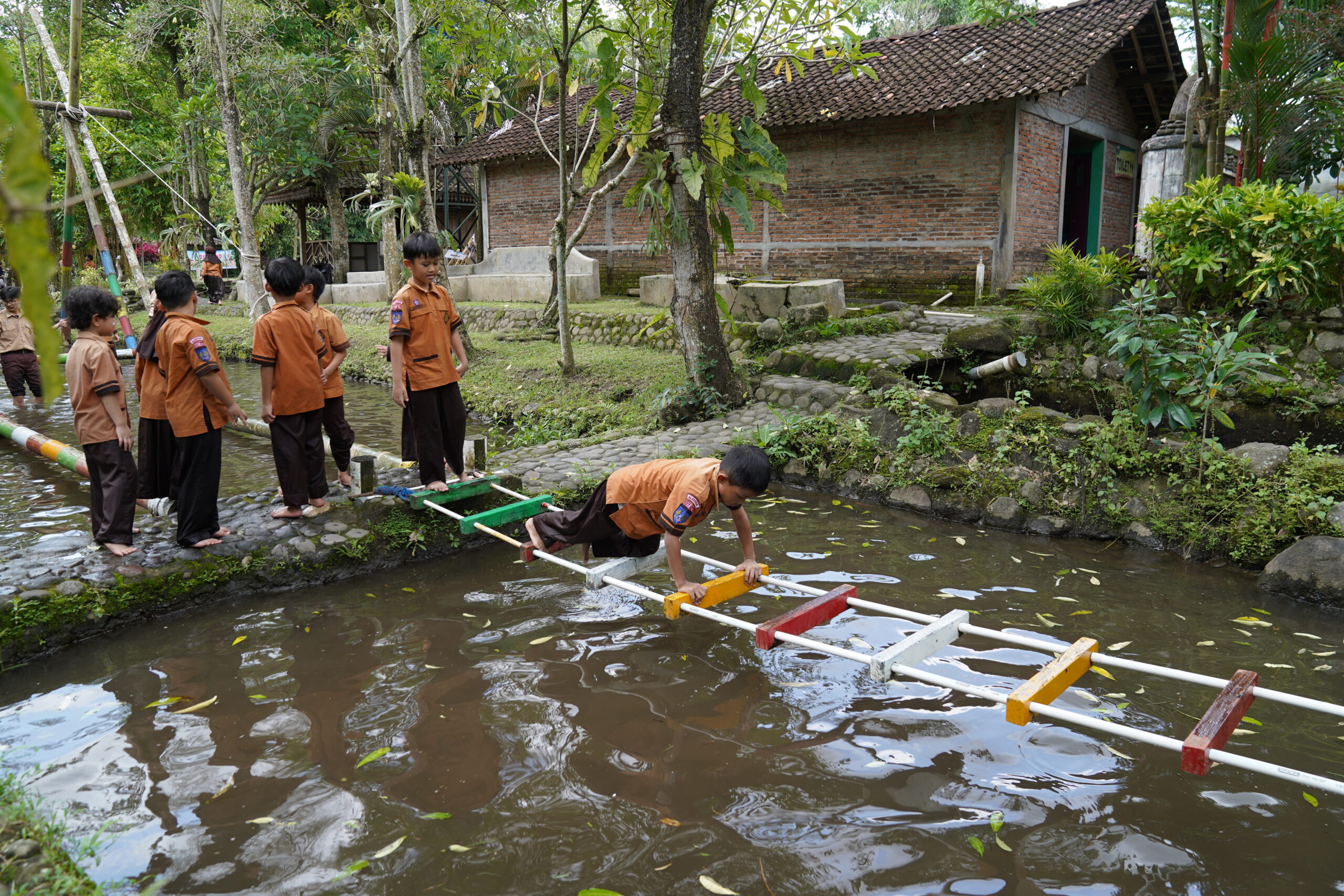 Selesai dengan wahana darat yang banyak menguji ketangkasan, kekompakan, dan koordinasi antarsiswa, mereka diajak memainkan permainan-permainan di air. Keceriaan semakin terasa. Bersentuhan dengan air membuat siswa kian antusias.