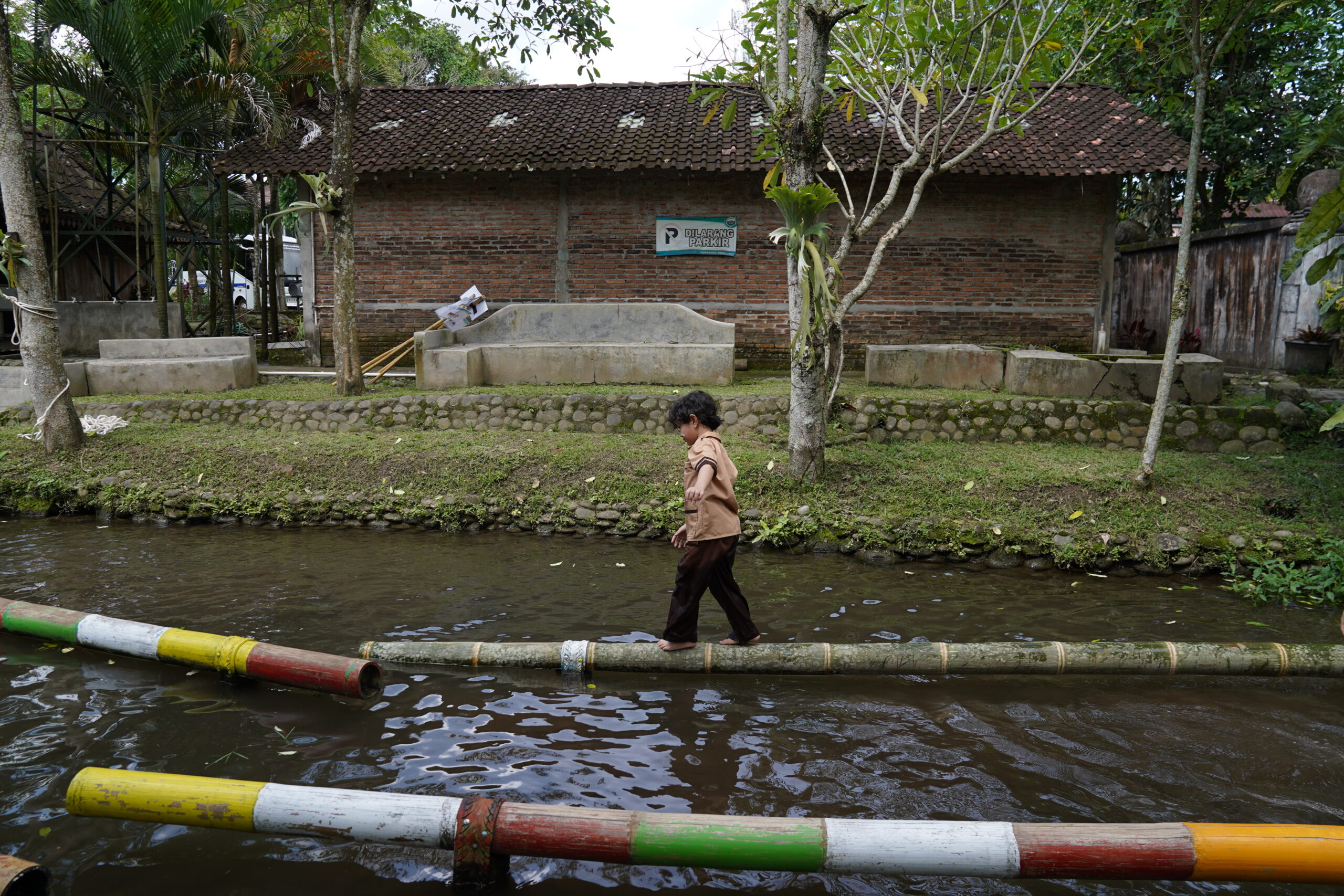 Potret seorang siswa sedang meniti jembatan balok didampingi seorang guru (Dokumentasi Tim Humas GIS 3 Jogja)