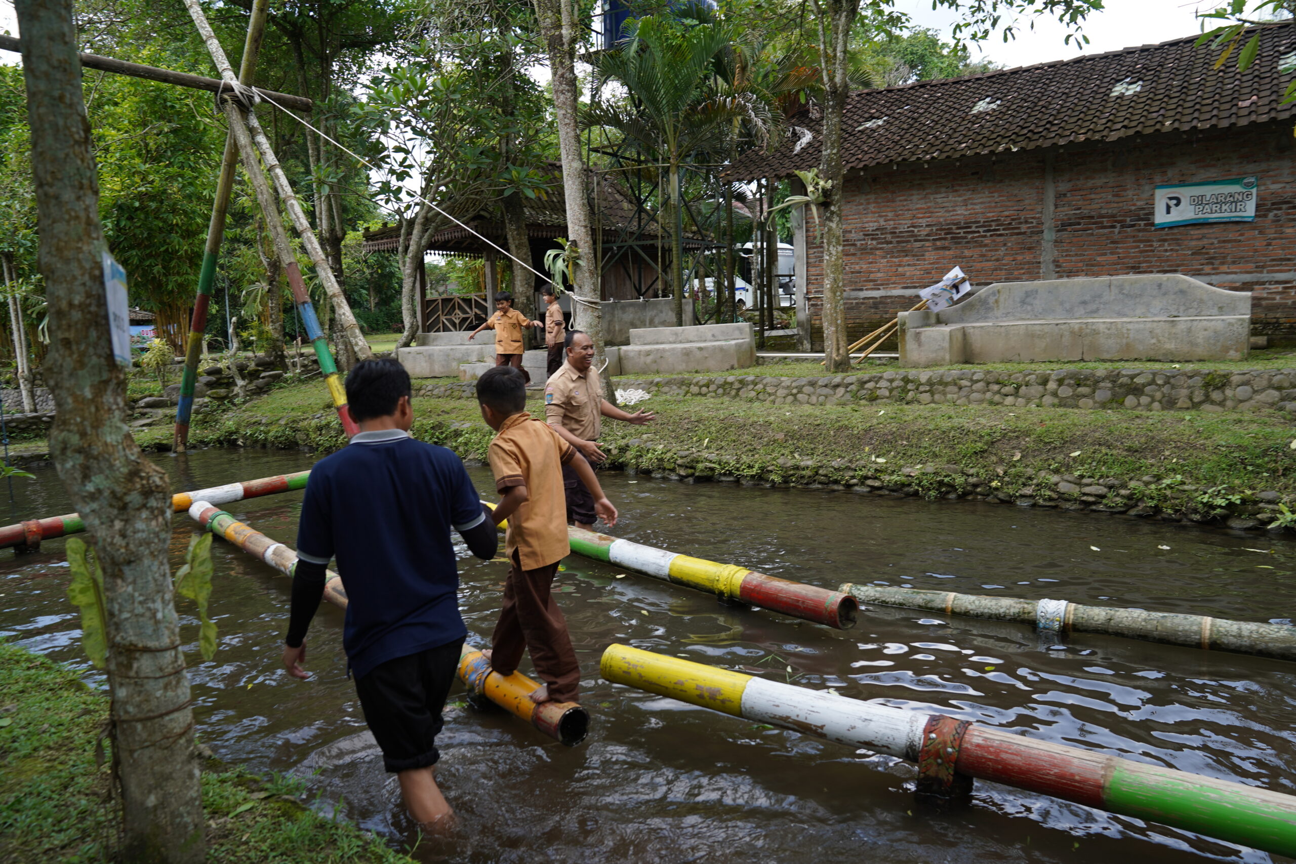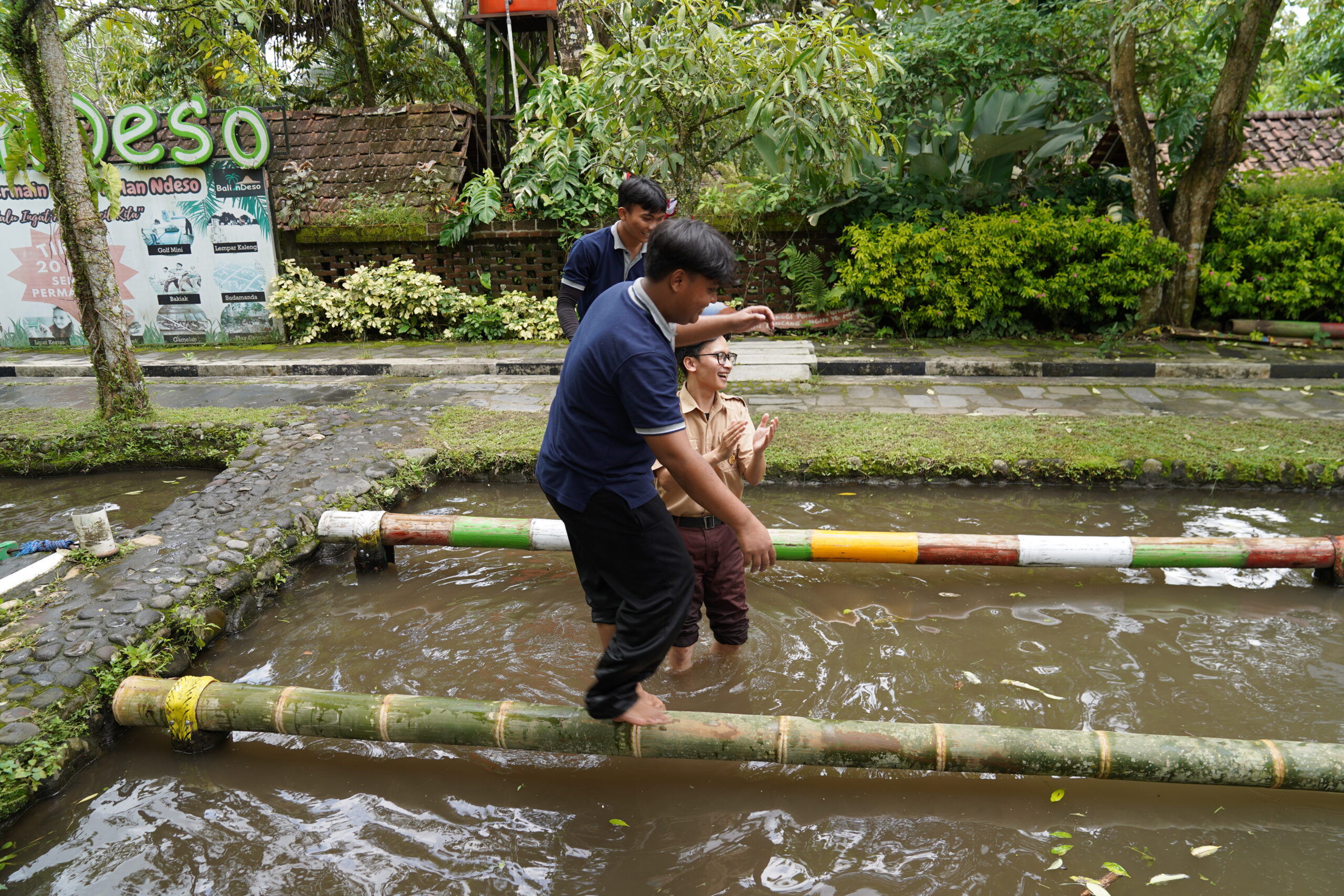 Potret antusiasme siswa menyelesaikan permainan outbound meski sudah basah kuyup (Dokumentasi Tim Humas GIS 3 Jogja)