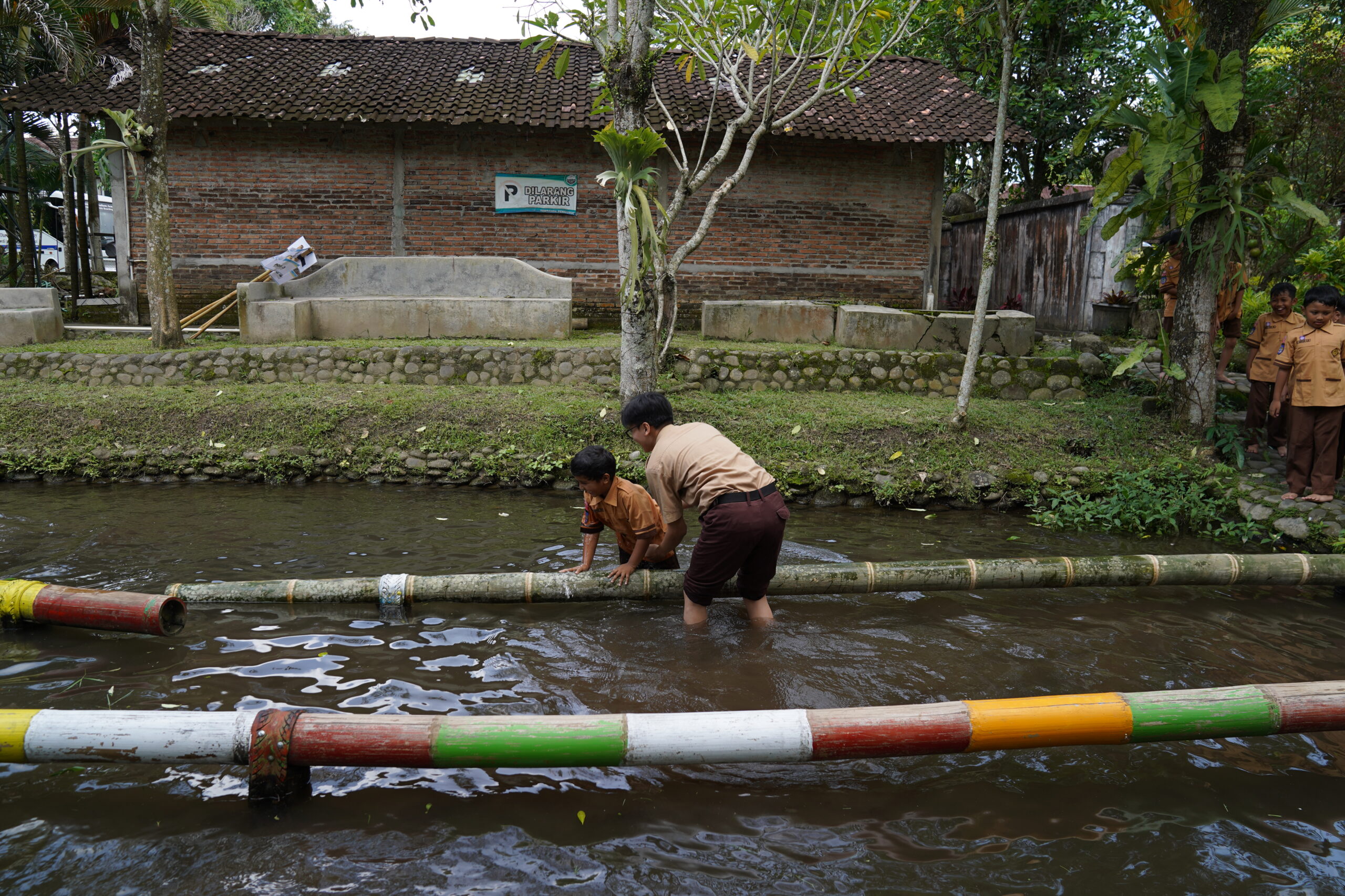 Siswa dalam satu barung bekerja sama untuk memasukkan bola ke dalam wadah melalui paralon